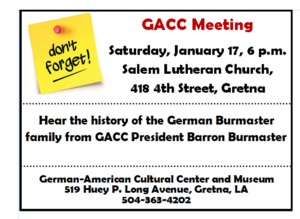Friends, don’t miss our meeting on Saturday January 17 at 6 p.m. at Salem Lutheran Church. The program will be about the history of German Burmaster family from GACC President Barron Burmaster. We hope to see you there!